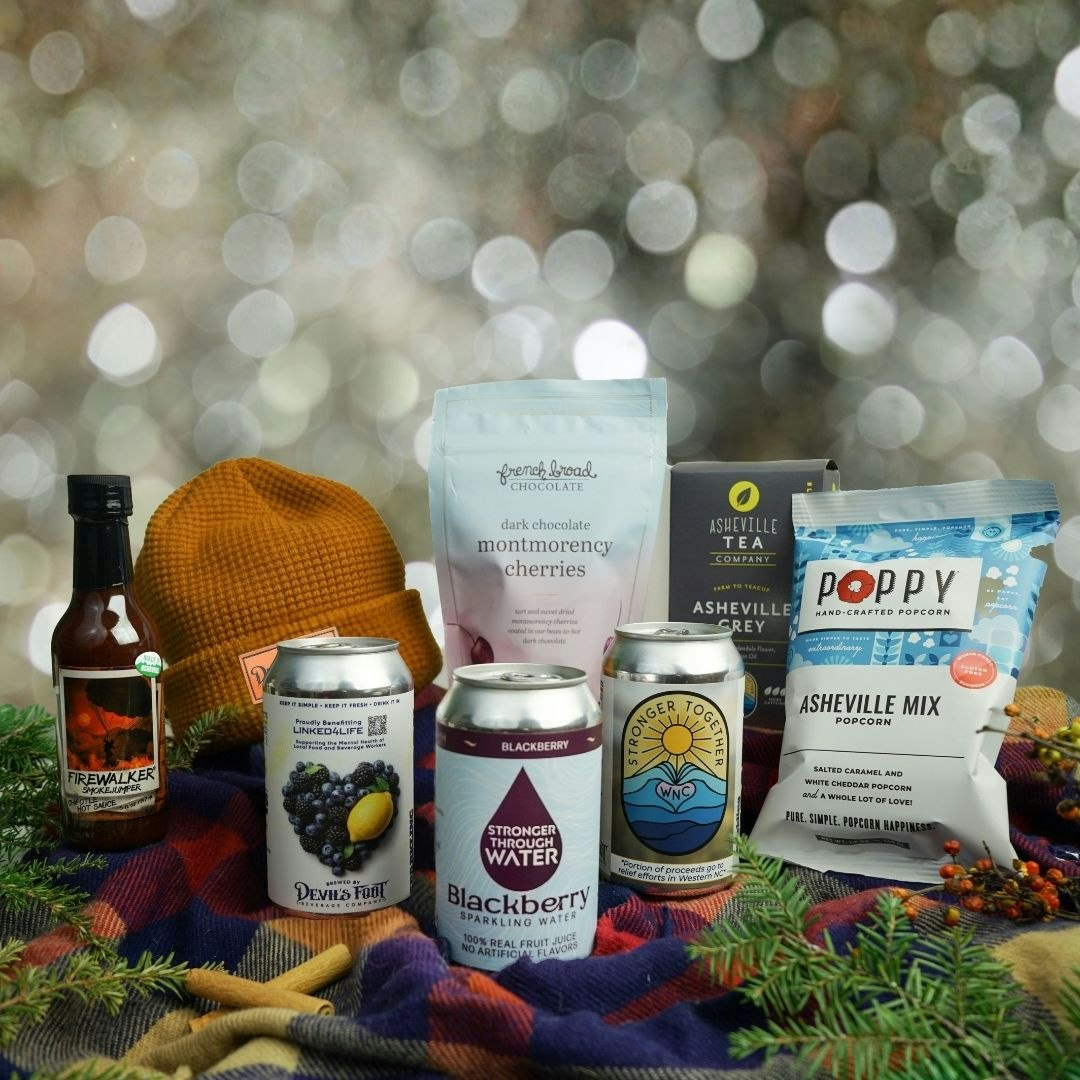 The WNC Strong Holiday Box is a collection of products from incredible makers and businesses that make Asheville so special – local favorites that capture the spirit of WNC in every sip, bite, and cozy moment.